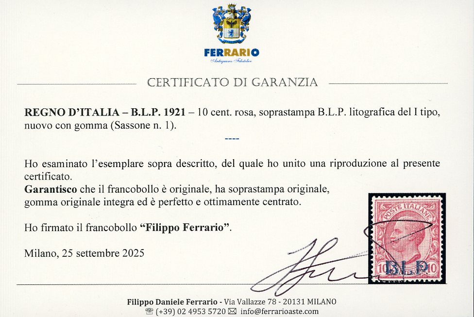 1921 - 10 cent., soprastampa BLP del I tipo (1), ottima centratura, nuovo, gomma originale integra, perfetto. Splendido. Fiecchi, cert. Ferrario.