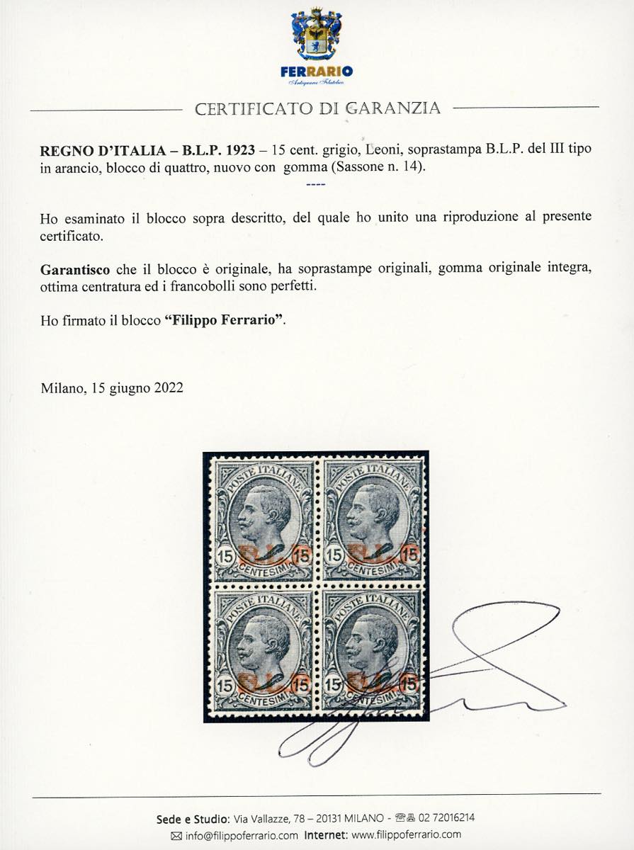 1923 - 15 cent., soprastampa BLP arancio del III tipo (14), ottima centratura, blocco di quattro, gomma originale integra, che presenta ... Leggi tutto