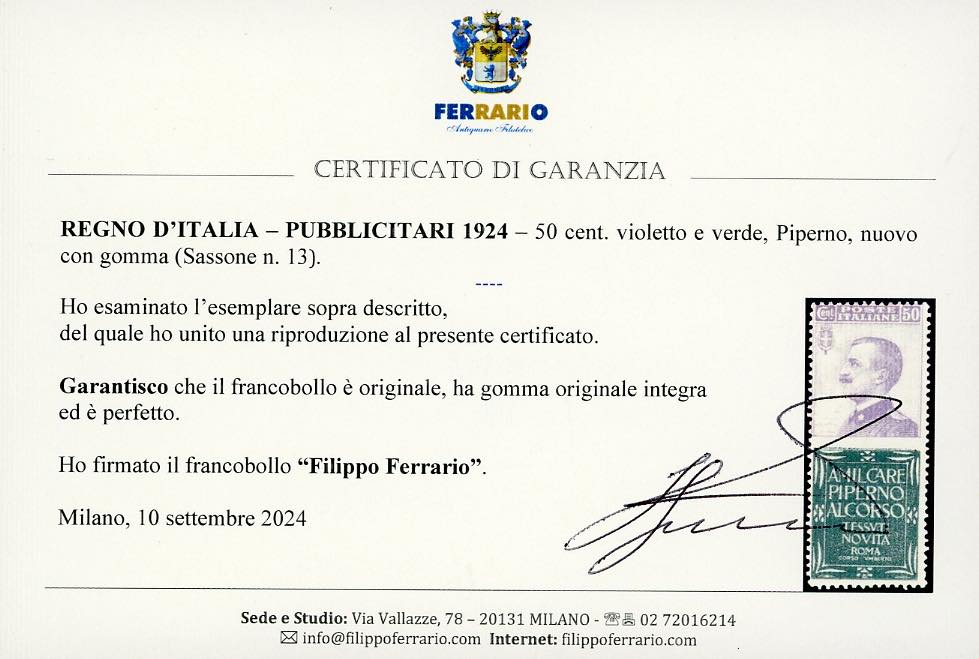1924 - 50 cent. Piperno (13), nuovo, gomma originale integra, perfetto e molto fresco. Centratura sopra la media. Cert. Ferrario.