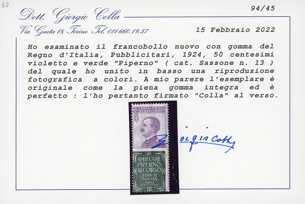 Lotto 1255 - 1924 - 50 cent. Piperno (13), nuovo, gomma originale ...