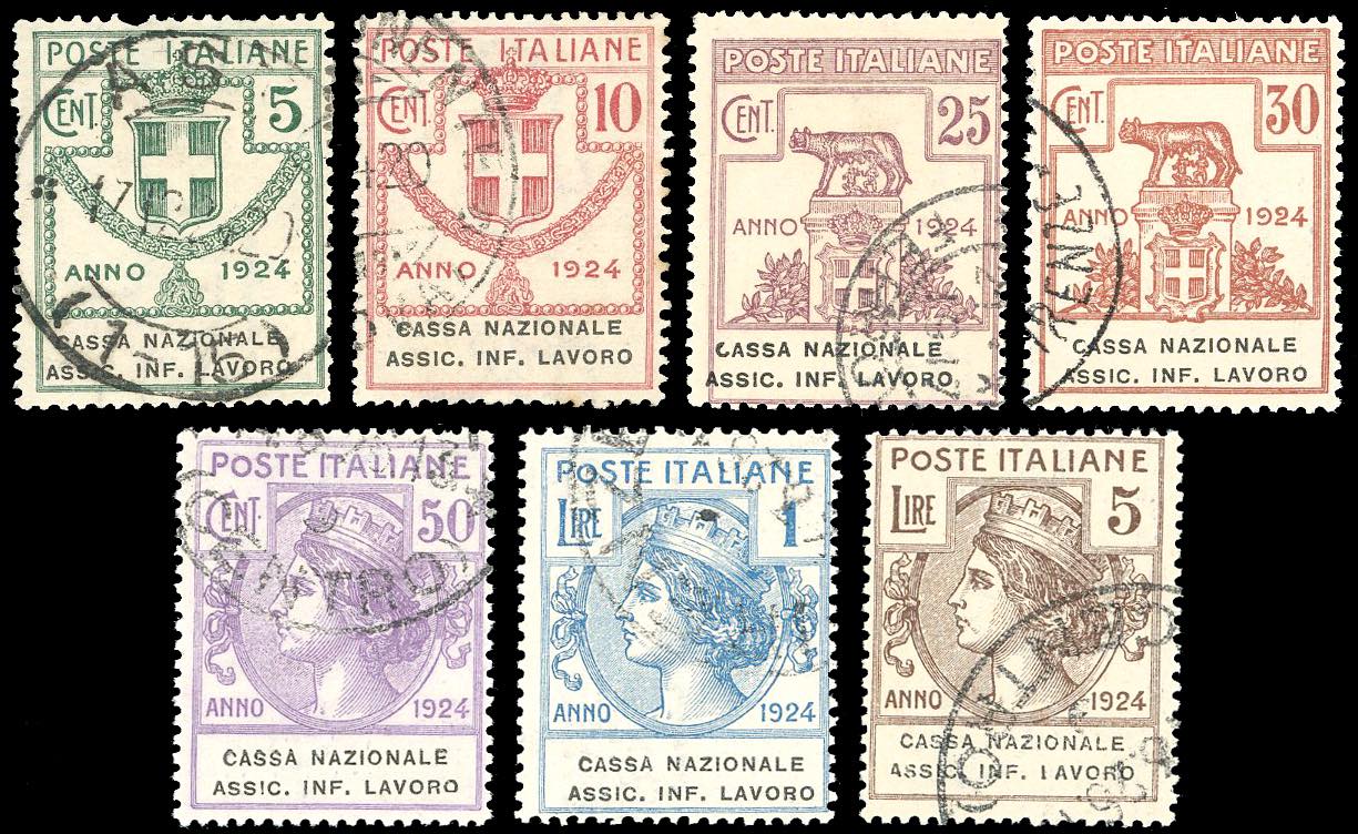 CASSA NAZIONALE ASSIC.INF.LAVORO 1924 - Serie completa (17/23), il 5 lire con varietà "IAVORO" n. 23d, usati, perfetti. Ferrario per i tre alti valori.