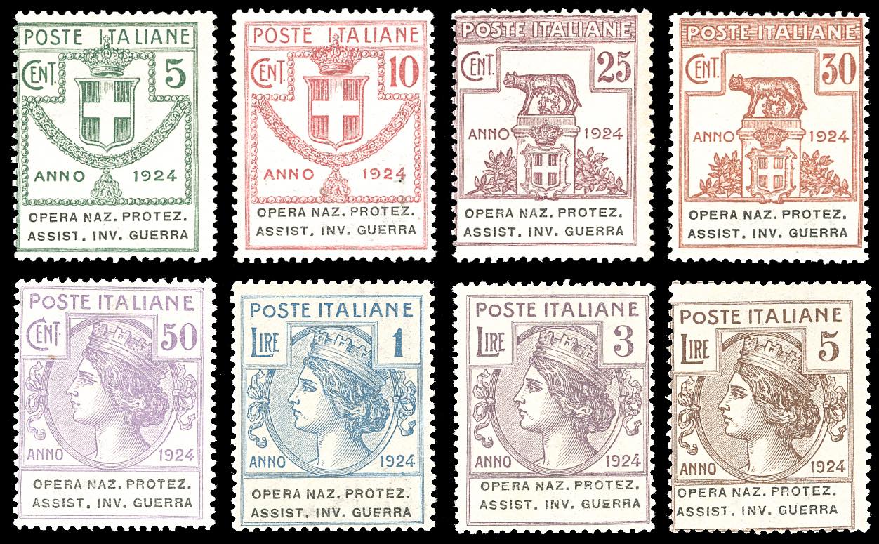 OPERA NAZ.PROTEZ.ASSIST.INV.GUERRA 1924 - Serie completa (50/57), gomma originale integra, perfetti. Rari e molto freschi. Cert. Cilio e Ferrario per i due alti valori, cert. Oro Raybaudi per il 5 lire.
