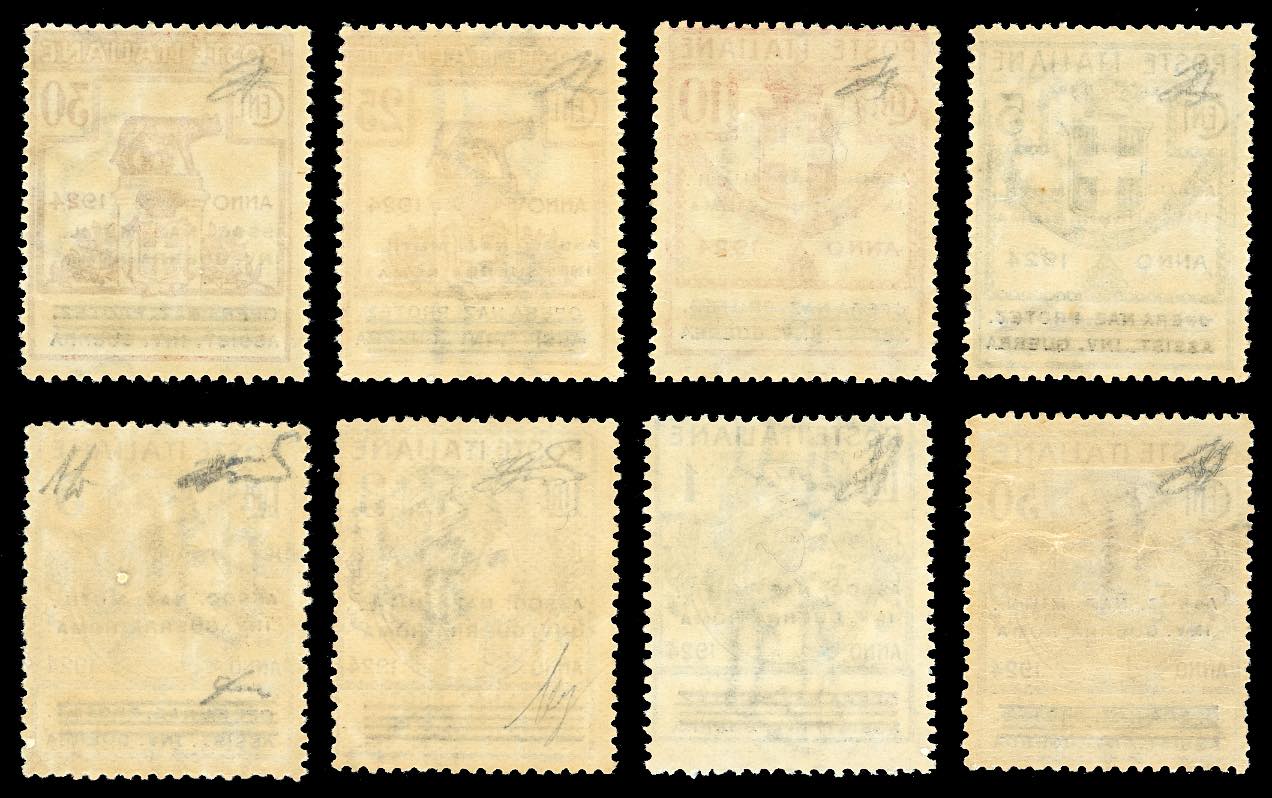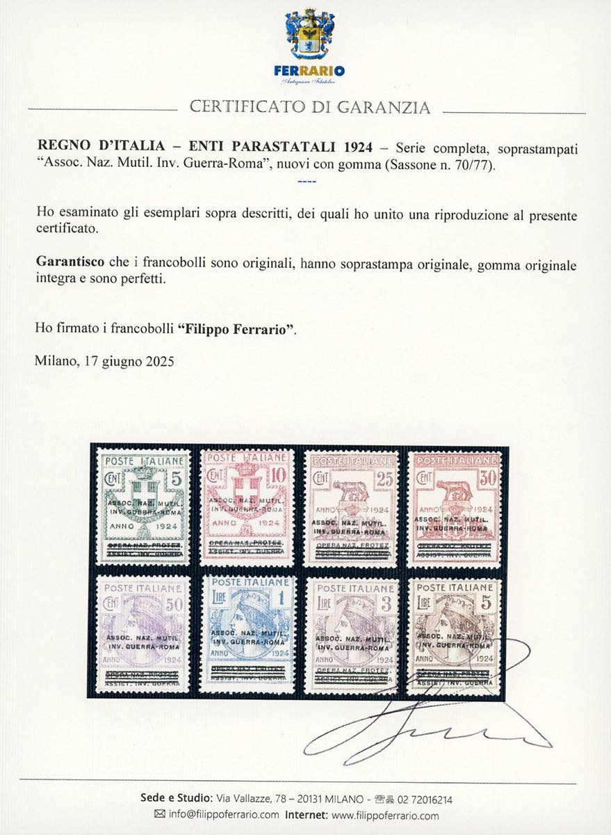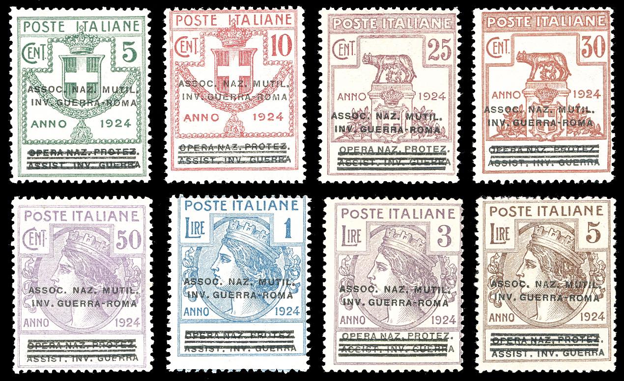 ASSOC.NAZ.MUTIL.INV.GUERRA-ROMA 1924 - Serie completa, soprastampati (70/77), nuovi, gomma originale integra, perfetti. Molto freschi. Cert. Ferrario.