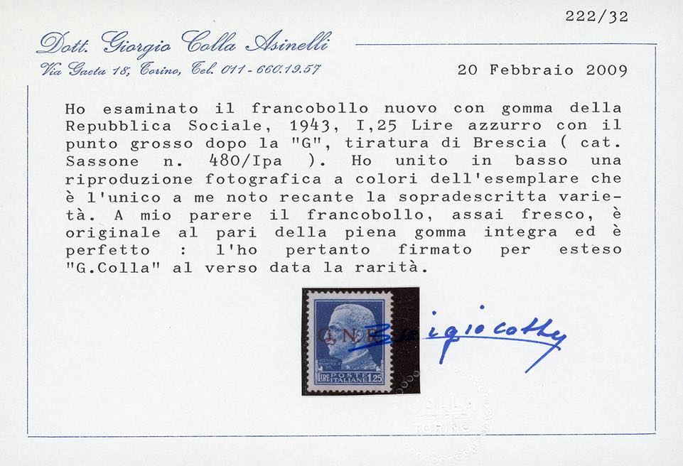 1943 - 1,25 lire, soprastampa G.N.R. di Brescia, I tipo, varietà punto grosso dopo la "G" (480/Ipa), nuovo, gomma originale integra, perfetto. Molto raro. Raybaudi, cert. Colla e Ferrario.