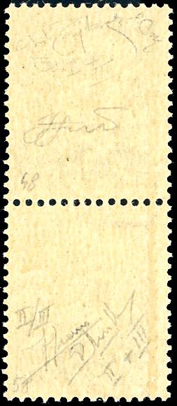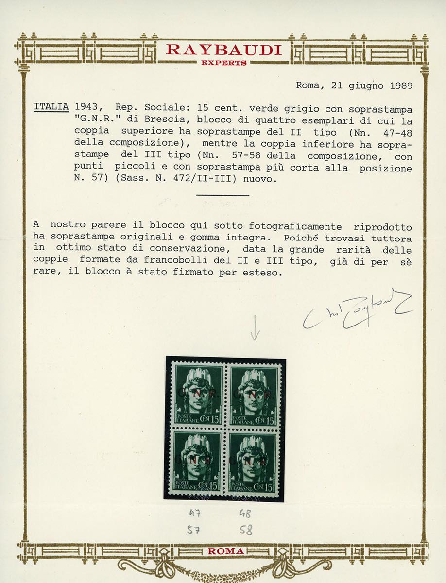 1943 - 15 cent., soprastampa G.N.R. di Brescia, coppia verticale con soprastampe del II e del III tipo (472/II-III), nuova, gomma originale integra, perfetta. Estremamente rara. Firmata Mondolfo, E.Diena, Sorani, Ferrario, cert. Oro Raybaudi del blocco di provenienza.