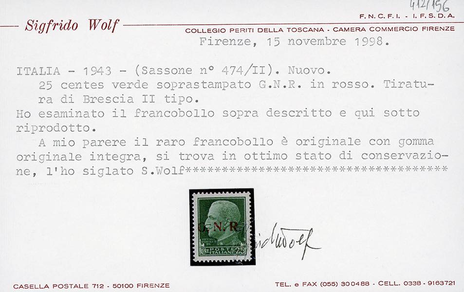 1943 - 25 cent., soprastampa G.N.R. di Brescia, II tipo (474/II), nuovo, gomma originale integra, perfetto. Raybaudi, Fiecchi, cert. Wolf e Ferrario.