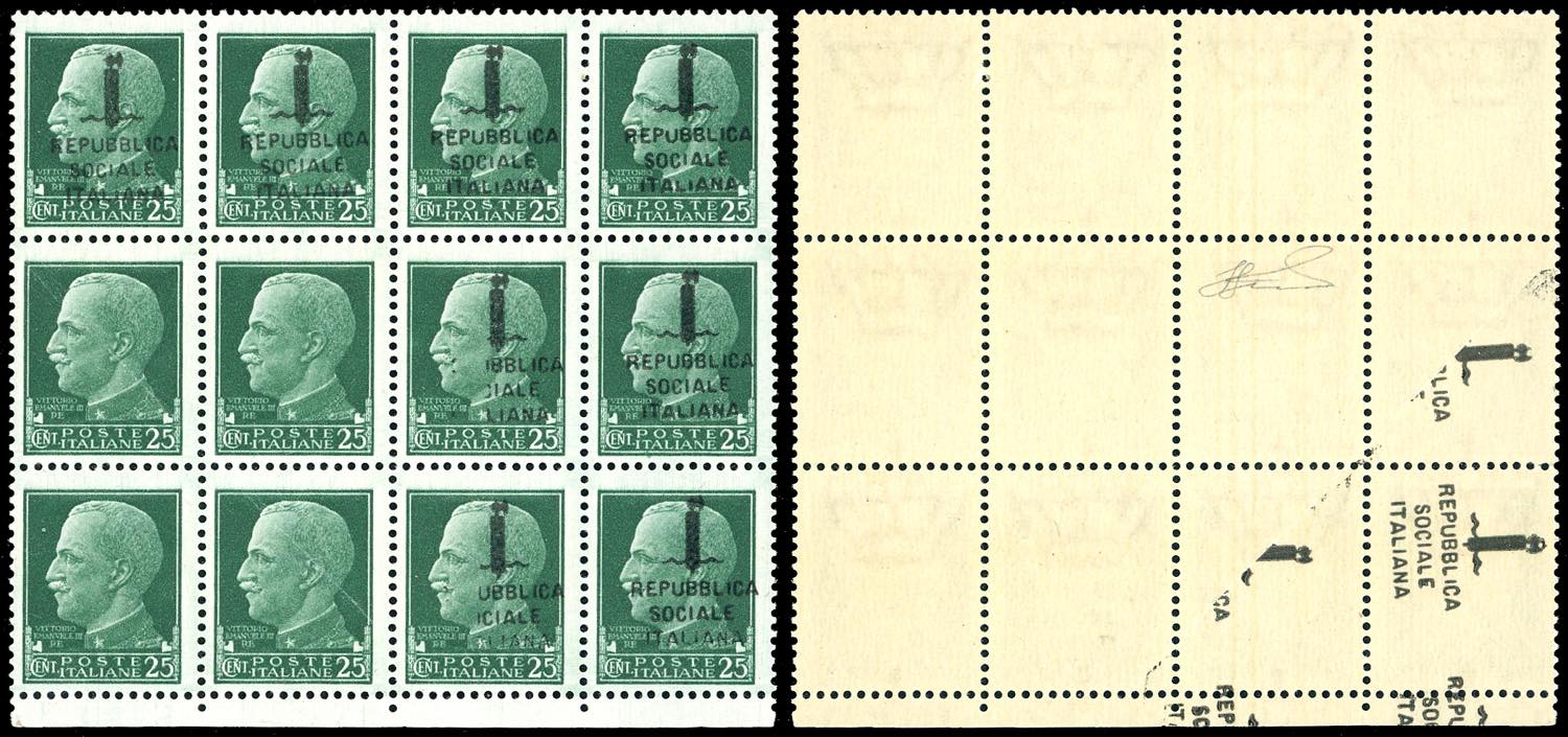 1944 - 25 cent. soprastampato, blocco di dodici comprendente due strisce orizzontali di quattro con due esemplari senza soprastampa e uno con soprastampa parziale (491mkb), soprastampe mancanti parzialmente impresse al verso a causa di un'anomala piegatura del foglio al momento della sovraimpressione, nuovo, gomma originale integra, perfetto. Bella varietà di grande impatto visivo. Ferrario.