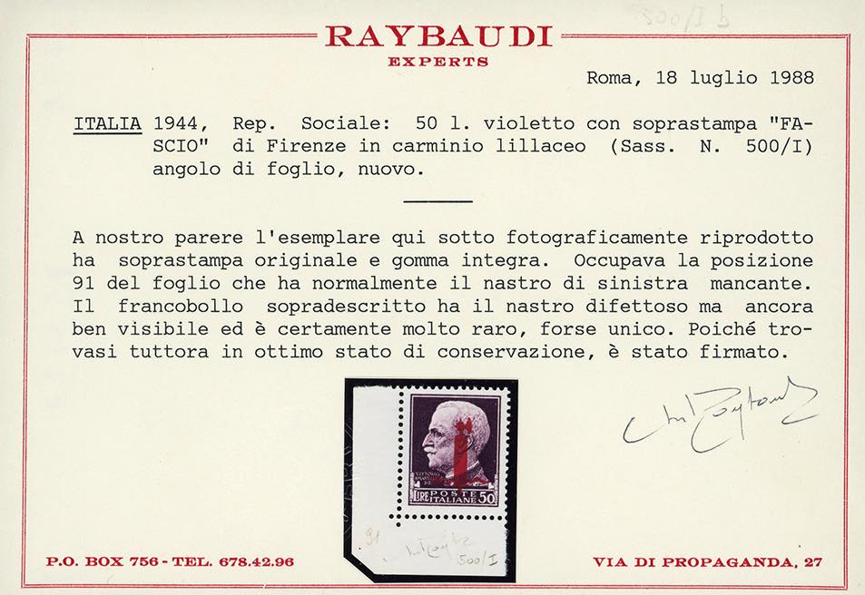 1944 - 50 lire, soprastampato fascio in carminio lillaceo, tiratura di Firenze, nastro di sinistra spezzato, posizione 91 (500/Ia), angolo di foglio, nuovo, gomma originale integra, perfetto. Estremamente raro, 4 o 5 esemplari noti. Ferrario, cert. Raybaudi.