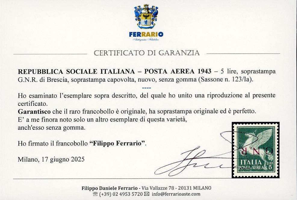 1943 - 5 lire, soprastampa G.N.R. di Brescia, soprastampa capovolta (123/Ia), nuovo, senza gomma, perfetto. Estremamente raro, si conosce un solo altro esemplare di questa varietà, anch'esso senza gomma. Cert. Ferrario.
