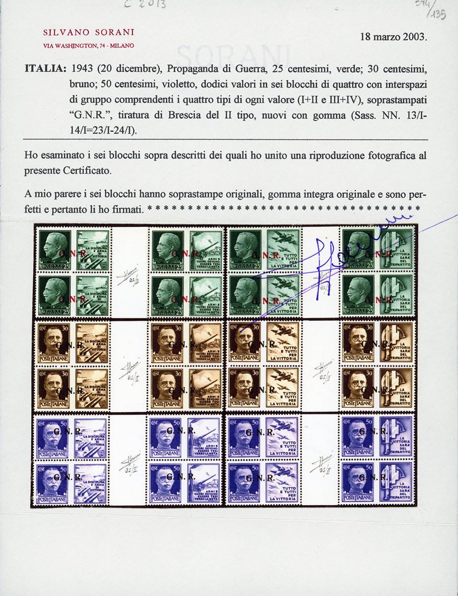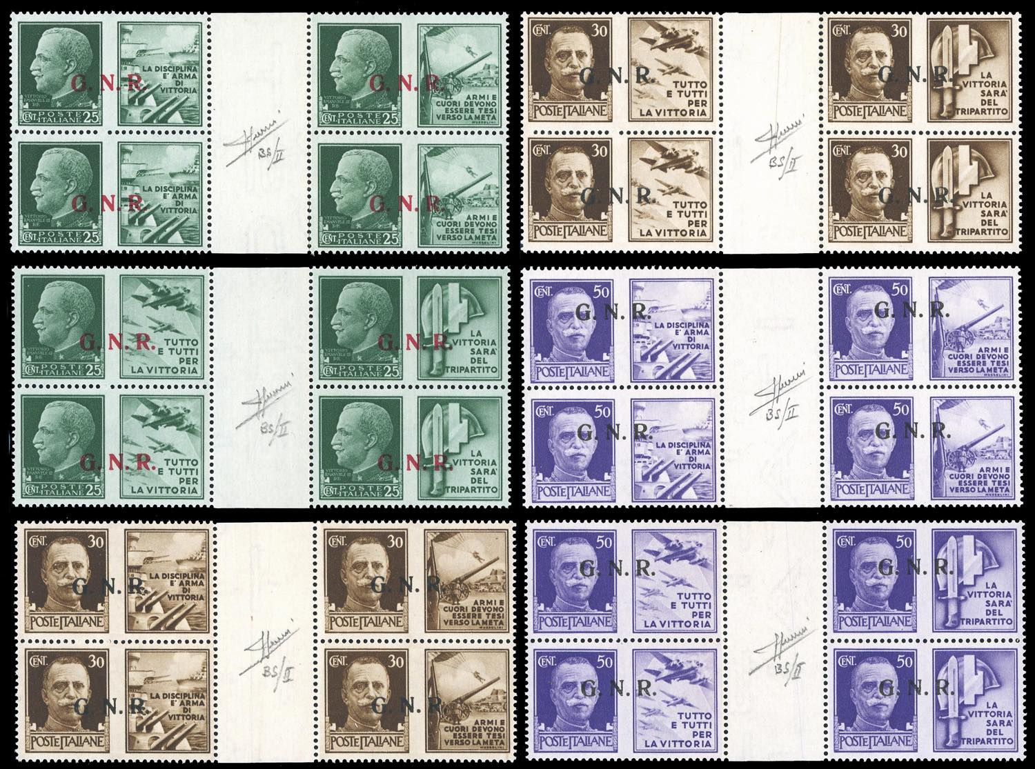 1944 - Soprastampati G.N.R. di Brescia, II tipo, serie completa in sei blocchi di quattro con interspazi di gruppo (13/II-24/II), nuovi, gomma originale integra, perfetti, dentellatura in parte aperta per il primo blocco. Cert. Sorani.