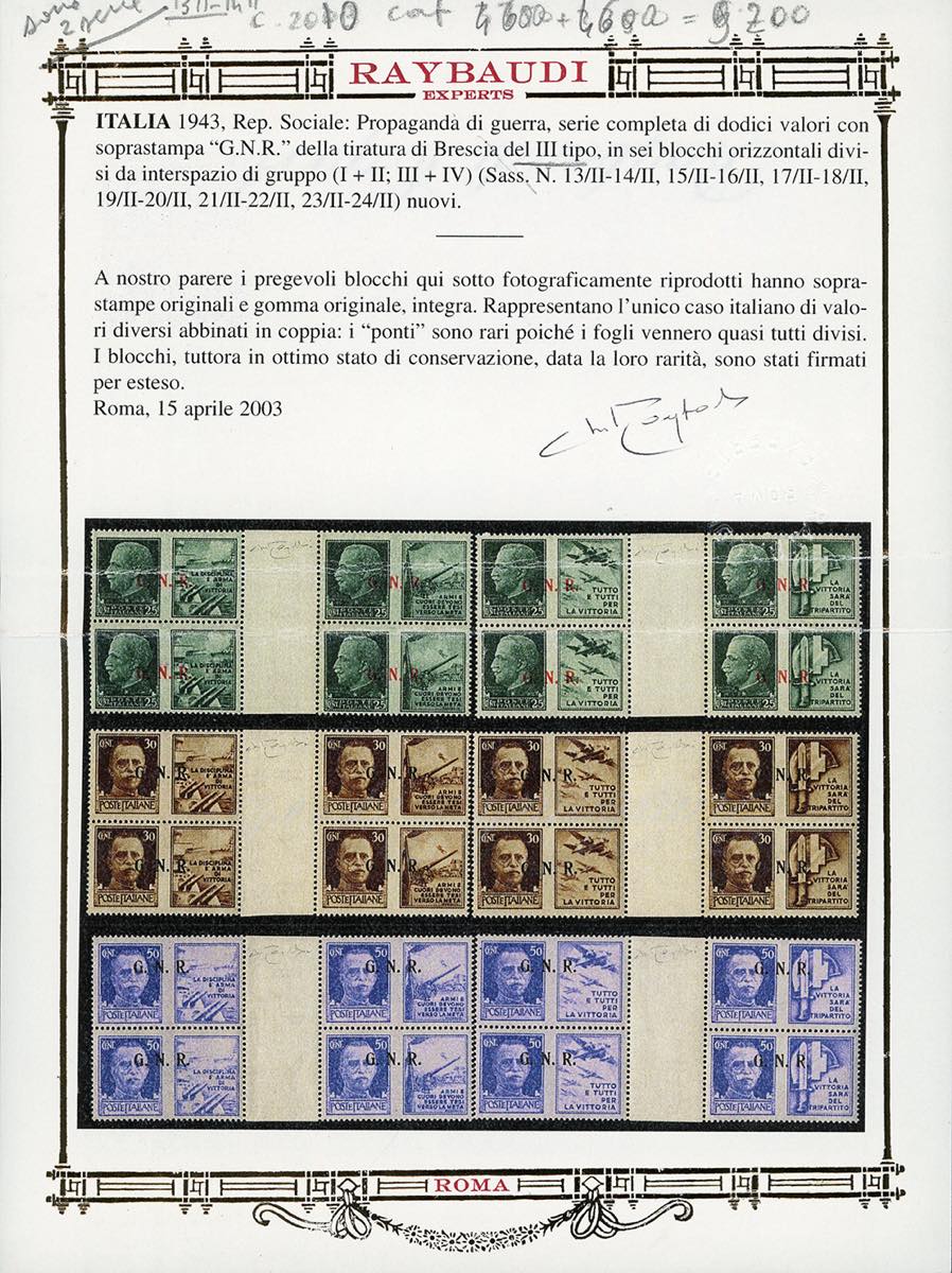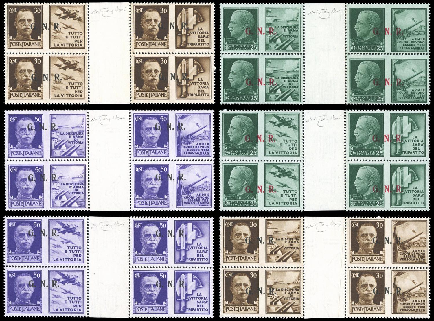 1944 - Soprastampati G.N.R. di Brescia, III tipo, serie completa in sei blocchi di quattro con interspazi di gruppo (13/III-24/III), nuovi, gomma originale integra, perfetti. Ottima qualità. Cert. Oro Raybaudi.