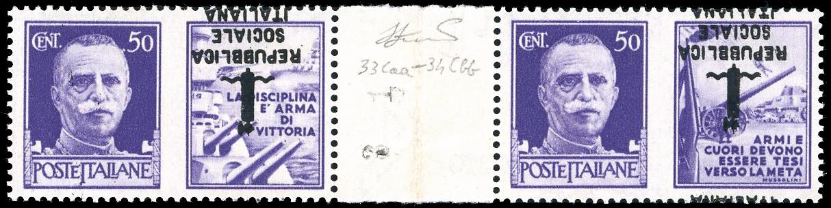 1944 - 50 cent. Marina ed Esercito, coppia orizzontale con interspazio di gruppo al centro, scambio di soprastampa, capovolta sulla vignetta e doppia per il secondo esemplare (33Caa,34Cbb), nuovo, gomma originale, il primo esempalre è leggermente assottigliato, il secondo è perfetto. Combinazione di varietà inedita con interspazio di gruppo al centro. Cert. Ferrario.