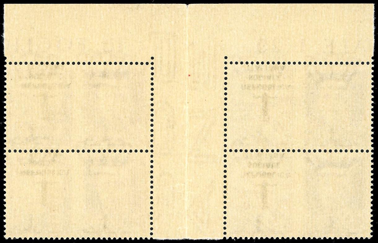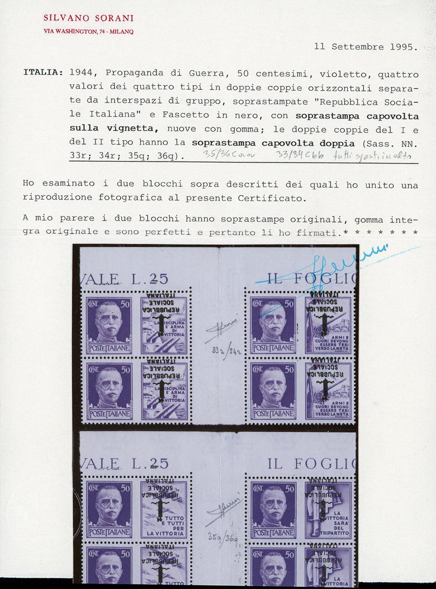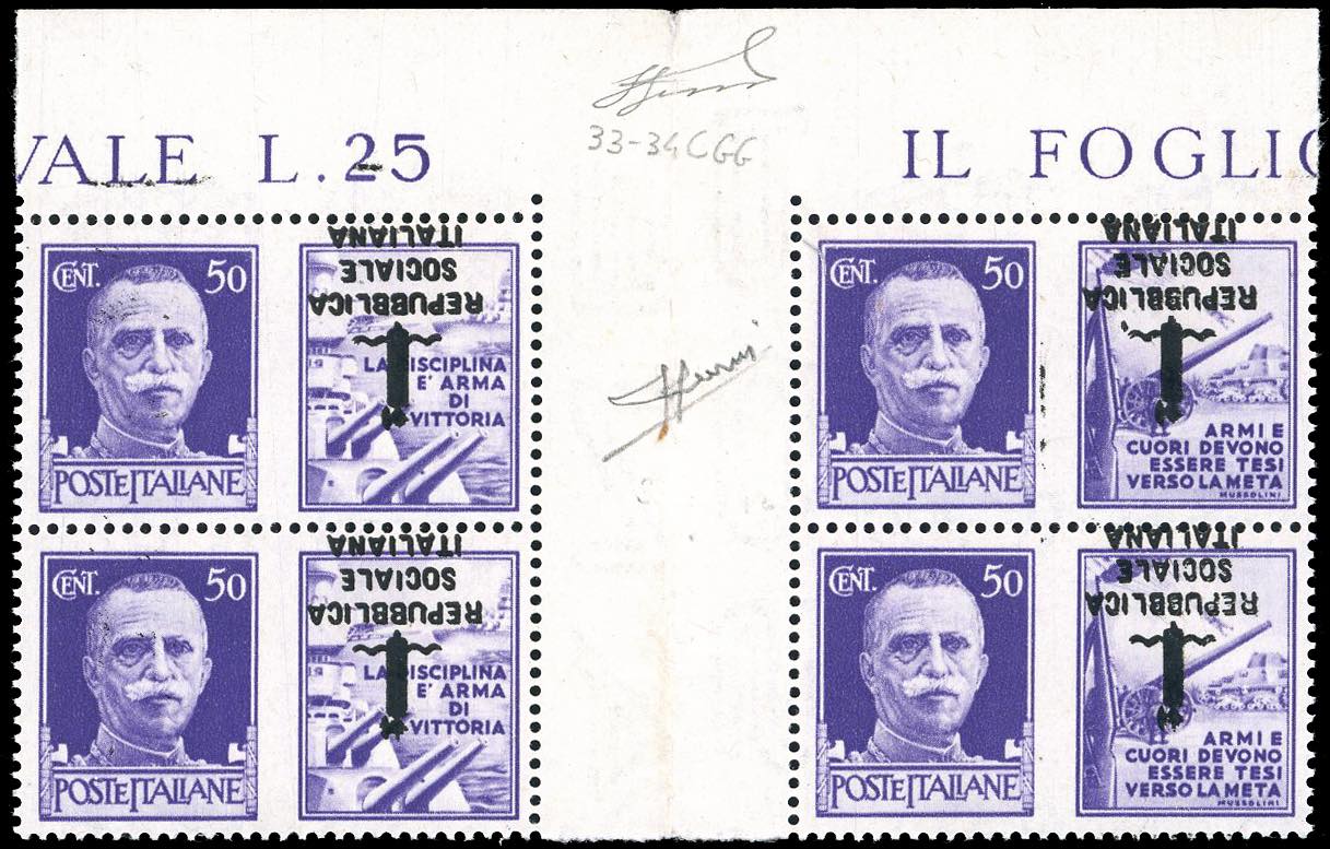 1944 - 50 cent. Marina ed Esercito, blocco di quattro esemplari con interspazio di gruppo al centro, scambio di soprastampa, capovolta e doppia sulla vignetta (33Cbb,34Cbb), nuovo, gomma originale integra, perfetto. Raro insieme, non catalogato con l'interspazio di gruppo. Cert. Sorani e Ferrario.