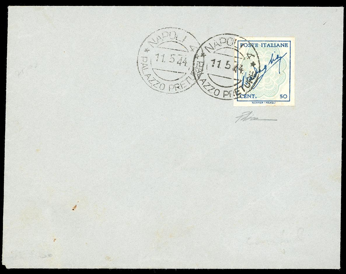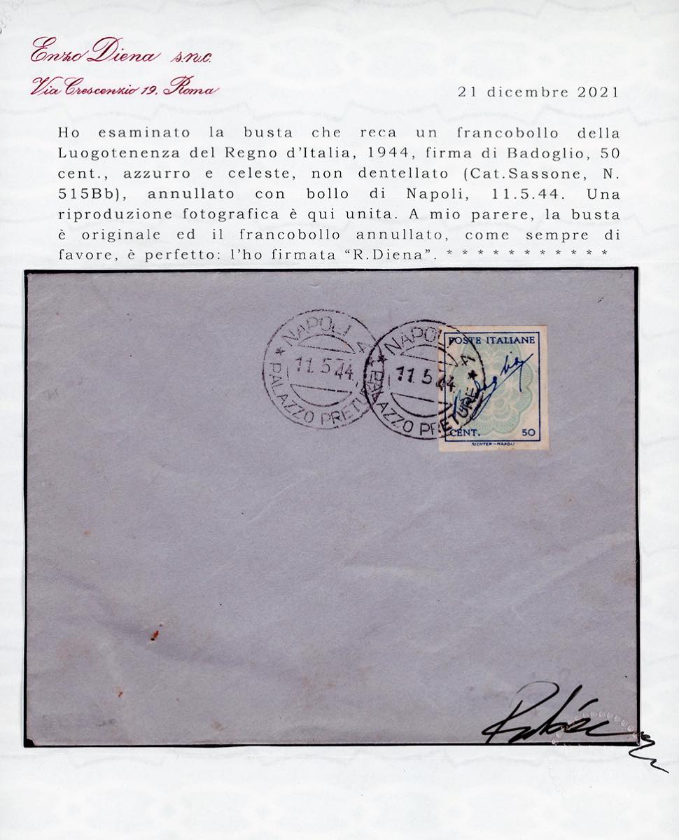 1944 - 50 cent. azzurro e celeste Badoglio, filigrana esagoni, non dentellato (515Bb), perfetto, annullato a Napoli 11/5/1944 su busta senza indirizzo. Insieme raro. Cert. Diena.