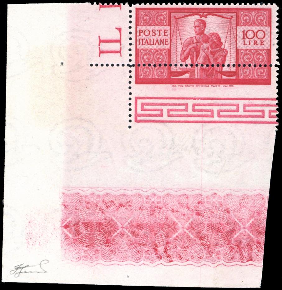 1946 - 100 lire Democratica, I lastra, dent. 14 x 13 1/4, carta bianca, dentellatura inferiore fortemente spostata in alto (Sass.spec.24aEc), eccezionale angolo integrale di foglio, gomma originale integra, perfetto. Spettacolare. Ferrario.
