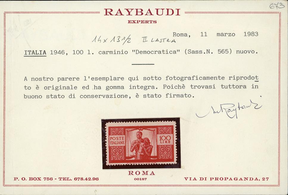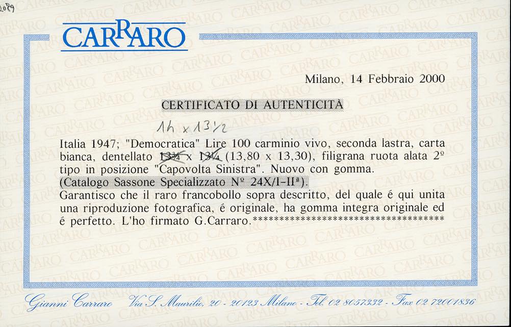 1946 - 100 lire Democratica, II lastra, dent. 14 x 13 1/2, carta bianca, filigrana ruota II tipo pos. CS, gomma originale integra, perfetto. Raro. Ferrario, cert. Carraro e Raybaudi.