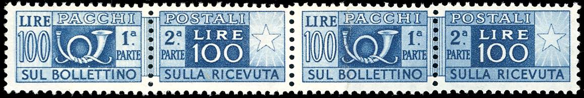 1946 - 100 lire, filigrana ruota, coppia orizzontale stampata su carta ricongiunta (77x), nuova, gomma originale integra, perfetta. ... Leggi tutto