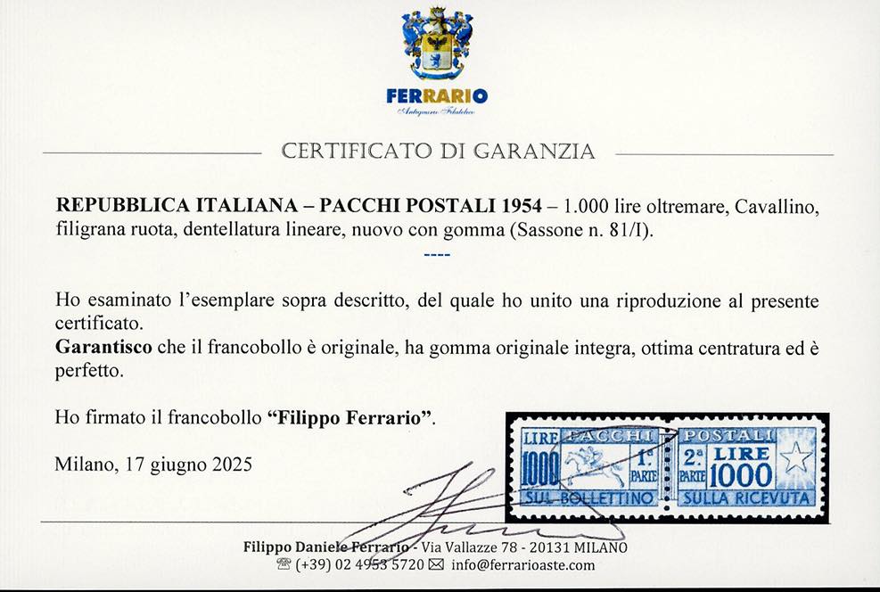 1954 - 1.000 lire Cavallino, filigrana ruota, dent. lineare (81/I), buona centratura, nuovo, gomma originale integra, perfetto. Cert. Ferrario.