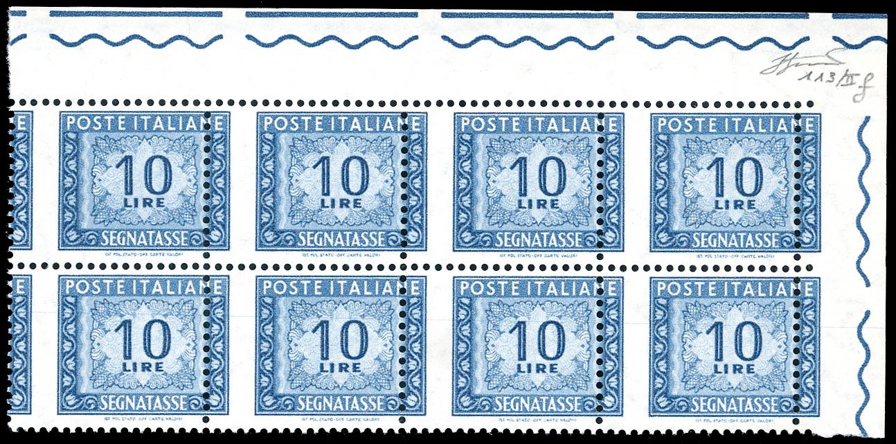 1962 - 10 lire, filigrana stelle del IV tipo, dentellatura verticale fortemente spostata a sinistra (113/IIf), blocco di otto esemplari, angolo di foglio, nuovo, gomma originale integra, perfetto. Ferrario.