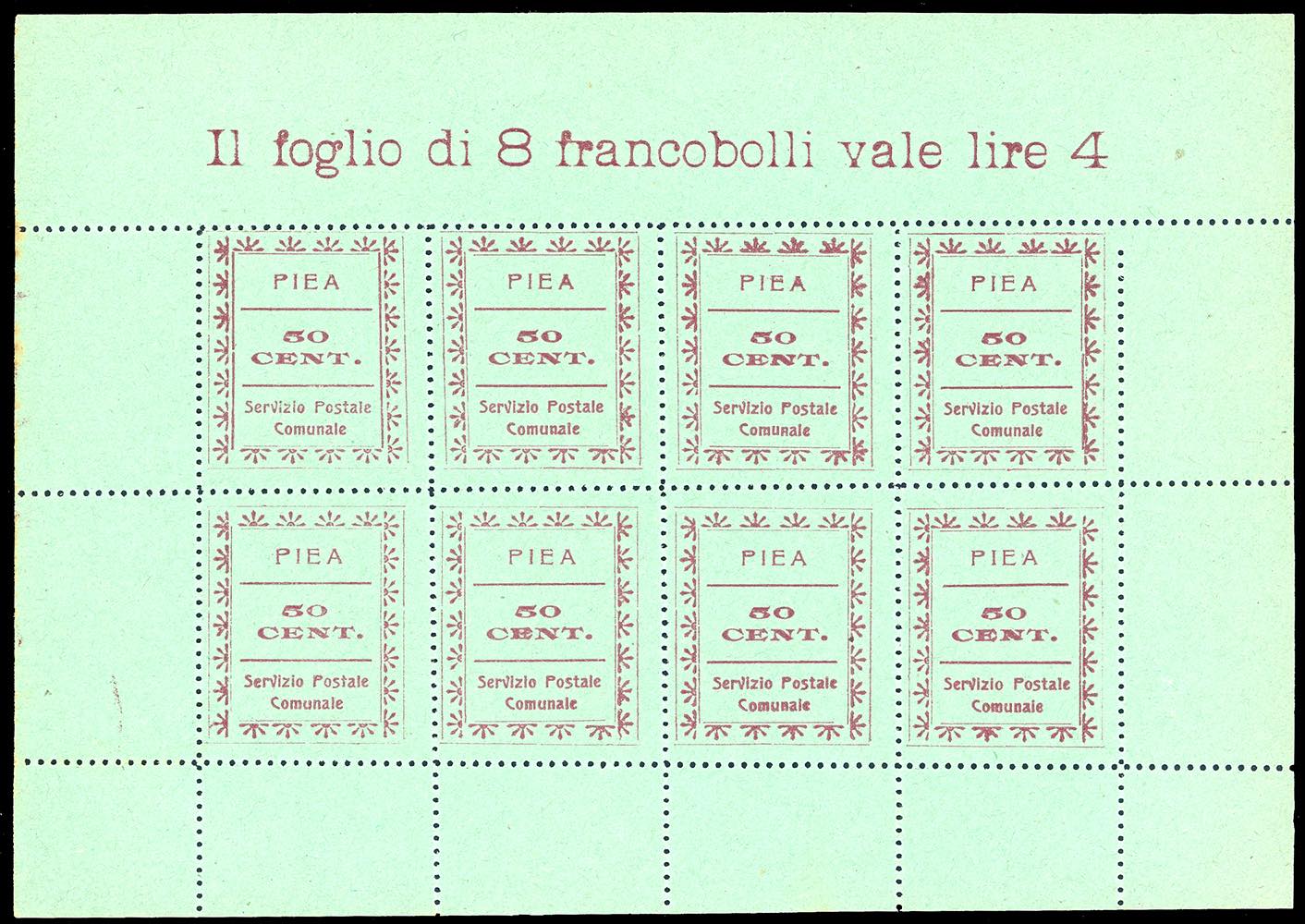 PIEA 1944 - 50 cent. lacca su verde (Unificato/CEI n.5), foglietto completo di otto esemplari, senza gomma come sempre, perfetto. Raro. Cert. E.Diena.