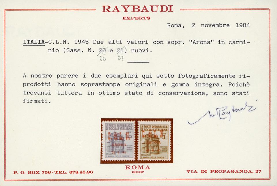 ARONA 1945 - 25 cent., 1 lira e 3 lire Monumenti Distrutti, soprastampa rossa (20,22,23), nuovi, gomma integra, perfetti. Ottima qualità. Sorani, cert. Raybaudi e Ferrario.