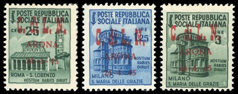ARONA 1945 - 25 cent., 1 lira e 3 lire Monumenti Distrutti, soprastampa rossa (20,22,23), nuovi, gomma integra, perfetti. Ottima qualità. ... Leggi tutto