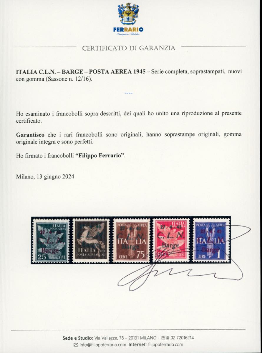 BARGE POSTA AEREA 1945 - Serie completa, soprastampati (12/16), nuovi, gomma originale integra, perfetti. Molto belli. Mondolfo, cert. Ferrario e Raybaudi.