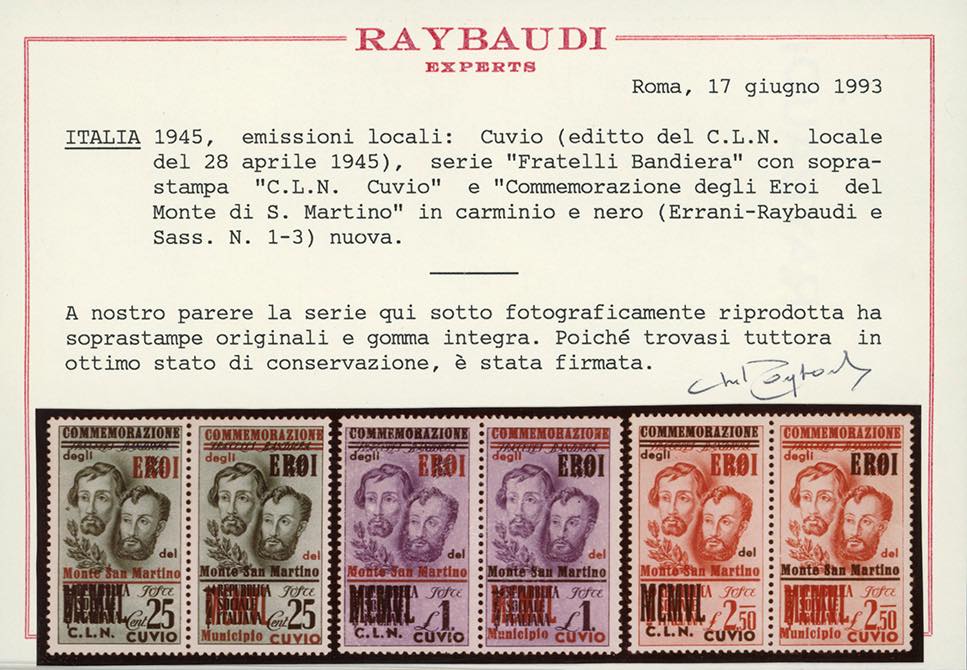 CUVIO 1945 - Fratelli Bandiera, serie completa in coppie orizzontali con i due tipo di soprastampa (1+4,2+5,3+6), nuove, gomma originale integra, perfette, tutte con al verso il consueto timbrino recante ramo d'alloro. Ottima qualità. Rare, tiratura 300 serie, quasi tutte usate. Cert. Raybaudi.