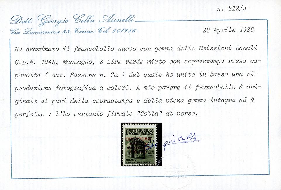 MACCAGNO 1945 - 3 lire Monumenti Distrutti, soprastampa capovolta (7a), nuovo, gomma originale integra, perfetto. Molto raro. Sassone, Ferrario, cert. Colla.