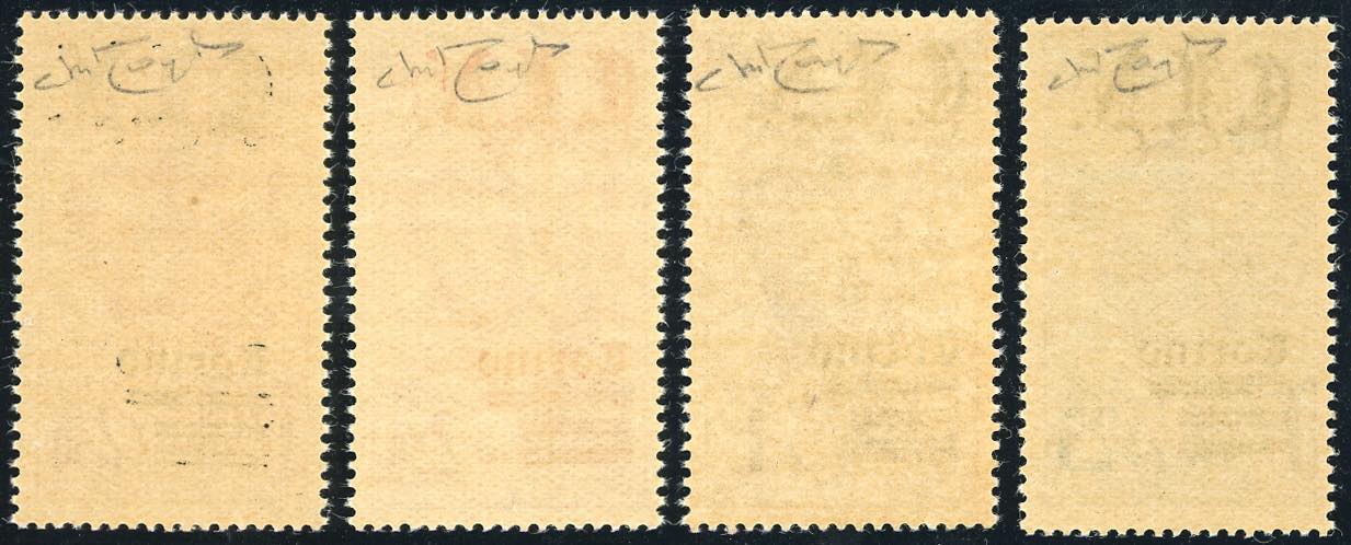 TORINO 1945 - Fratelli Bandiera, 25 e 50 cent. soprastampa verde anziché rossa, 2,50 lire, un esemplare con soprastampa rossa anziché verde, uno con soprastampa nera anziché verde (Errani Raybaudi vedi nota,CEI P32/P34,Unificato 14 e 15,16f,16g), gomma originale integra, perfetti. Allestiti a titolo di prova. Rarissimi, pochi esemplari esistenti, probabile tiratura 50 serie. Raybaudi, cert. Toselli.