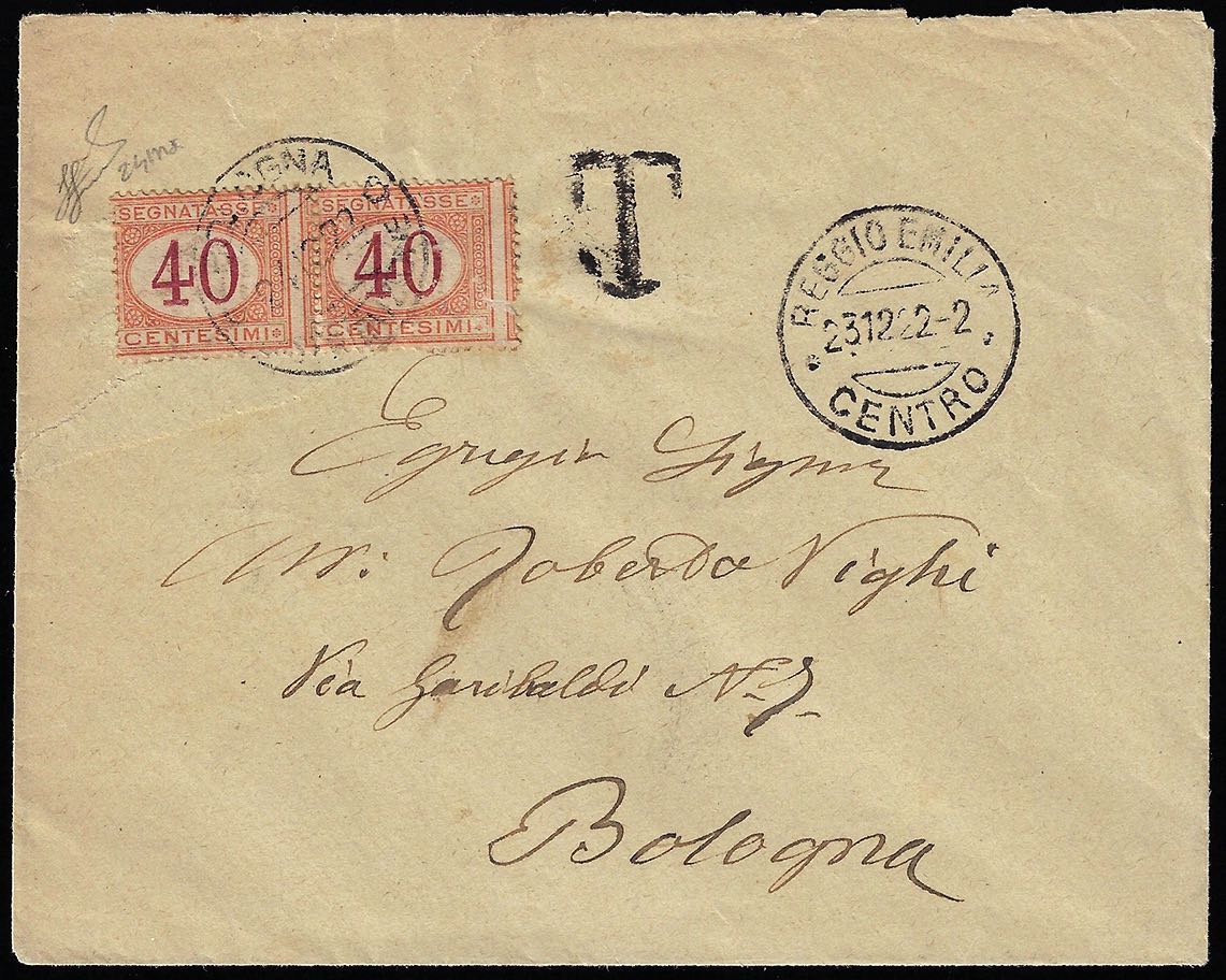 1922 - 40 cent. arancio e carminio, dentellatura verticale fortemente spostata a destra (24ma), coppia orizzontale, lievi difetti, su busta non affrancata da Reggio Emilia 23/12/1922 a Bologna 24/12/1922. Raro insieme! Ferrario.
