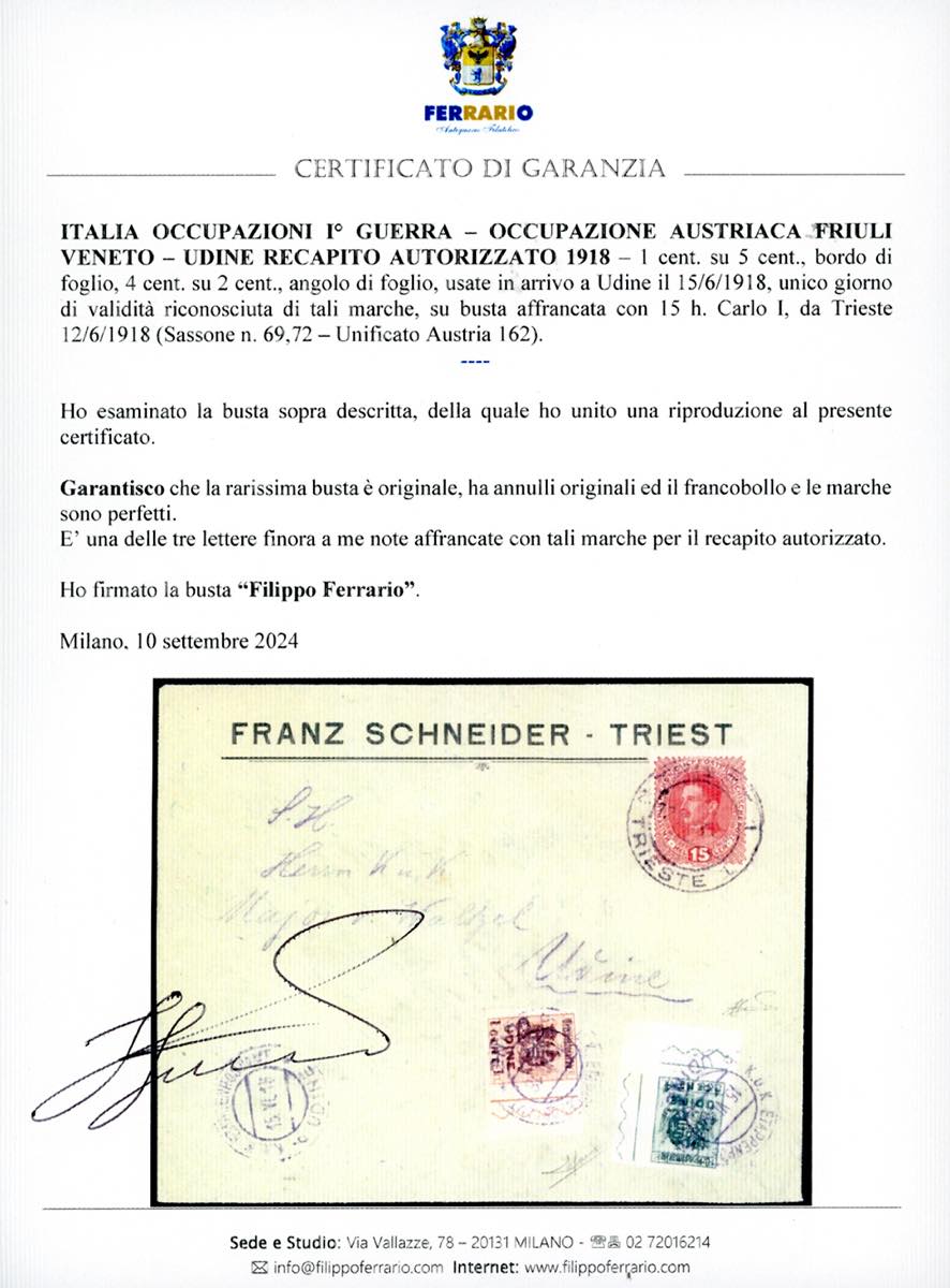 OCCUPAZIONE AUSTRIACA FRIULI-VENETO RECAPITO AUTORIZZATO 1918 - 1 cent. su 5 cent. e 4 cent. su 2 cent. Udine (69,72), la prima bordo, la seconda angolo di foglio, perfette, usate in arrivo ad Udine il 15/6/1981, unico giorno di validità riconosciuta di tali marche, su busta affrancata con 15 h. Carlo I (Austria 162) da Trieste 12/6/1918. UNA DELLE TRE LETTERE NOTE AFFRANCATE CON QUESTE MARCHE PER IL RECAPITO AUTORIZZATO. Rarità del settore. Cert. Sorani e Ferrario.