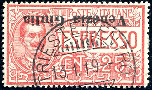 VENEZIA GIULIA ESPRESSI 1919 - 25 c. rosso, soprastampa capovolta (1a), usato, perfetto. Ferrario.