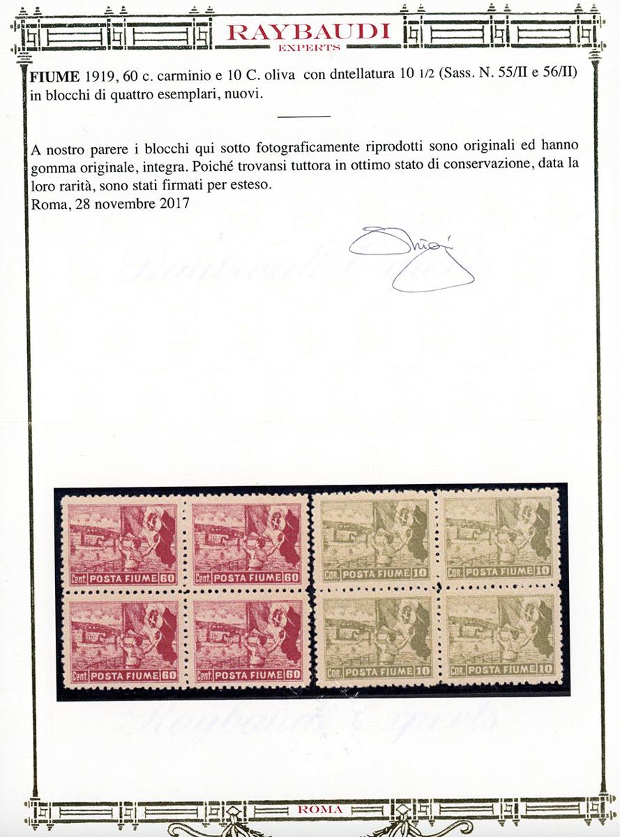 FIUME 1919 - 60 cent. e 10 cor. Posta Fiume, dent. 10 1/2 (55/II,56/II), blocchi di 4, gomma originale integra, perfetti. Rari. Cert. Oro Raybaudi.
