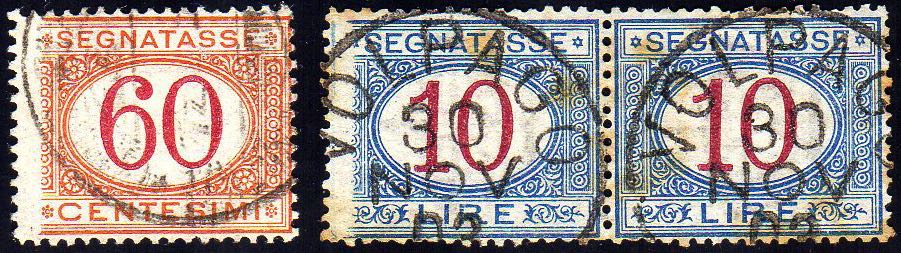 1890 - 60 cent. arancio e carminio, 10 lire azzurro e carminio (26,28), entrambi con stampa mancante a sinistra, usati, lievi ossidazioni ... Leggi tutto