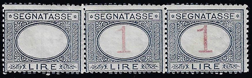 1890 - 1 lira azzurra e carminio, striscia orizzontale di tre, il primo esemplare senza la cifra, gli altri due con cifra evanescente ... Leggi tutto