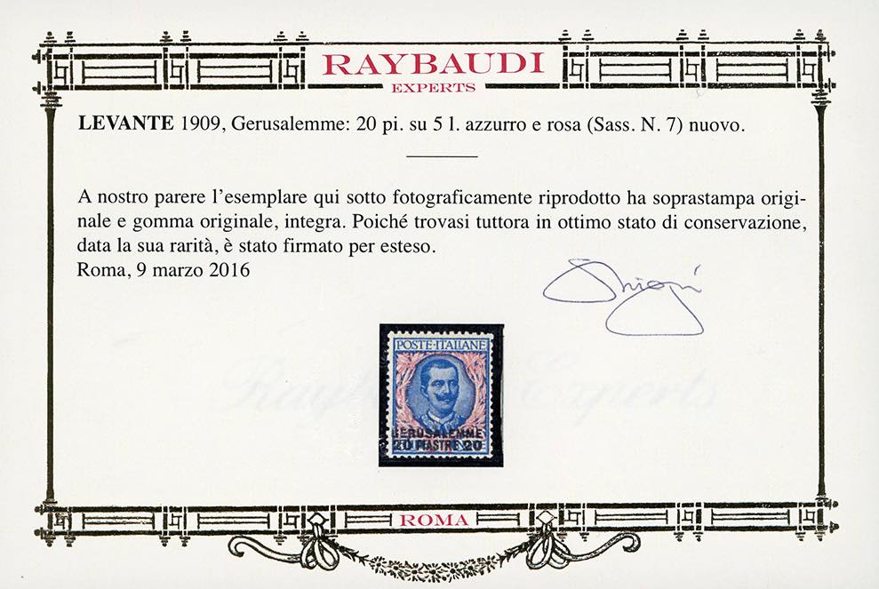 GERUSALEMME 1909/11 - Soprastampati, serie completa (1/8), nuovi, gomma originale integra, perfetti. Firmati A.Diena, il 5 lire, molto ben centrato, cert. Oro Raybaudi.