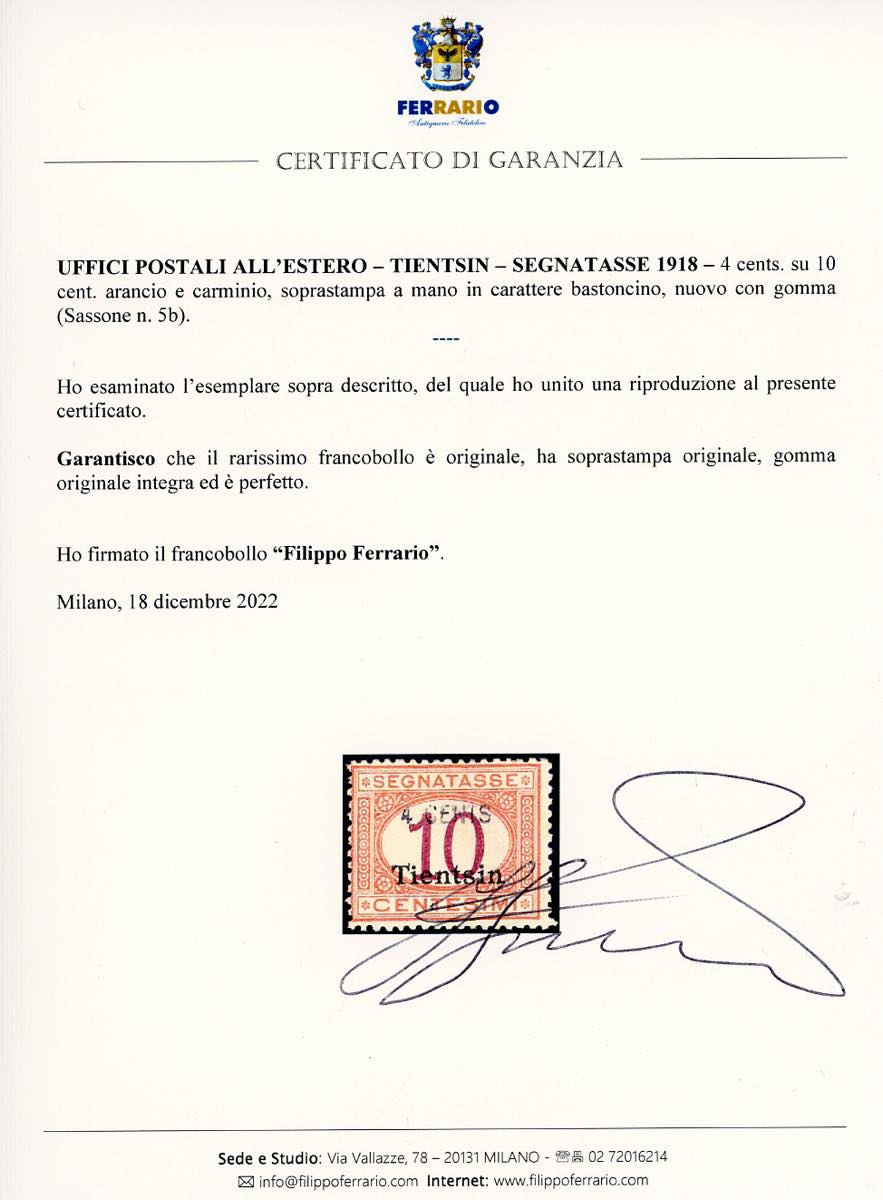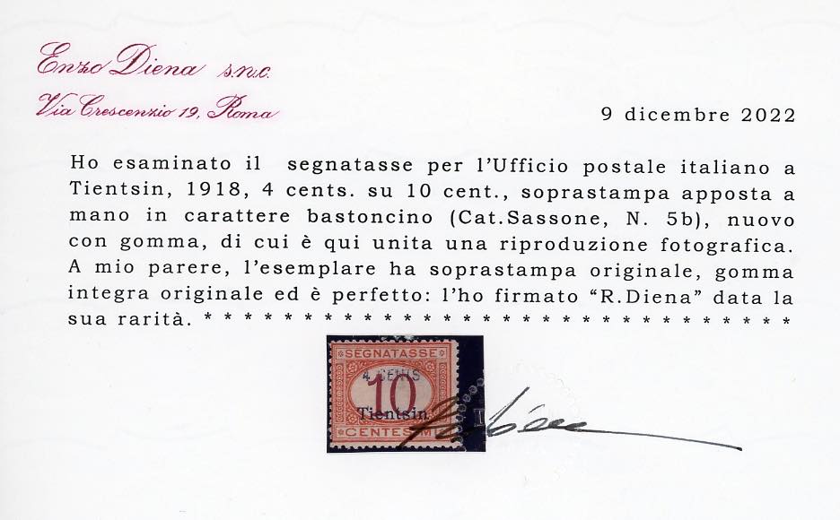 TIENTSIN SEGNATASSE 1918 - 4 cent. su 10 cent., SOPRASTAMPA A MANO in carattere bastoncino (5b), gomma originale integra, perfetto. Splendido ed estremamente raro. Cert. Ferrario e Diena.