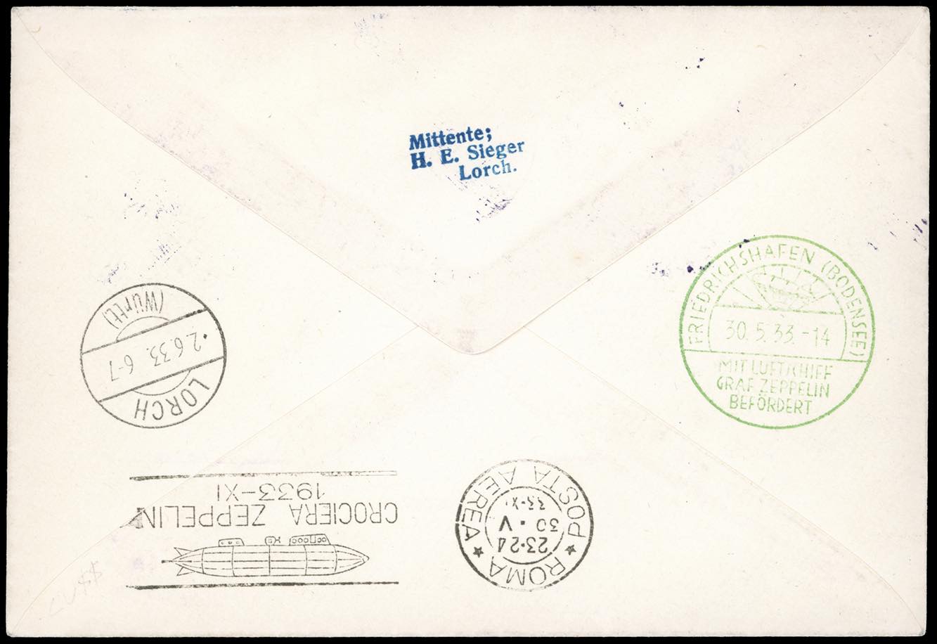 POSTA AEREA 1933 - 5 lire Zeppelin, con valori complementari (A13,Libia 53,106), perfetti, su aerogramma raccomandato da Tripoli 29/5/1933 a Friedrichshafen, viaggiato con la Crociera Italiana del dirigibile Graf Zeppelin, come da cachet speciale apposto al recto, bolli di transito e arrivo. Molto bello. Ferrario.