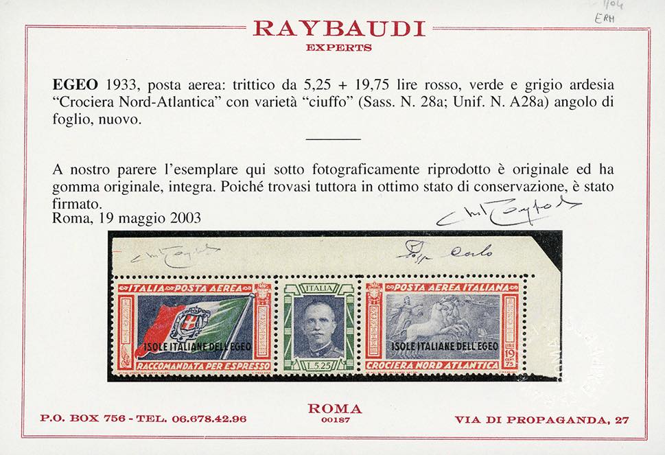 POSTA AEREA 1933 - 5,25 + 19,75 lire Trittico Balbo, varietà "ciuffo" (28a), angolo di foglio, nuovo, gomma originale integra, perfetto. Raro, pochi esemplari noti. G.Bolaffi, cert. Raybaudi.