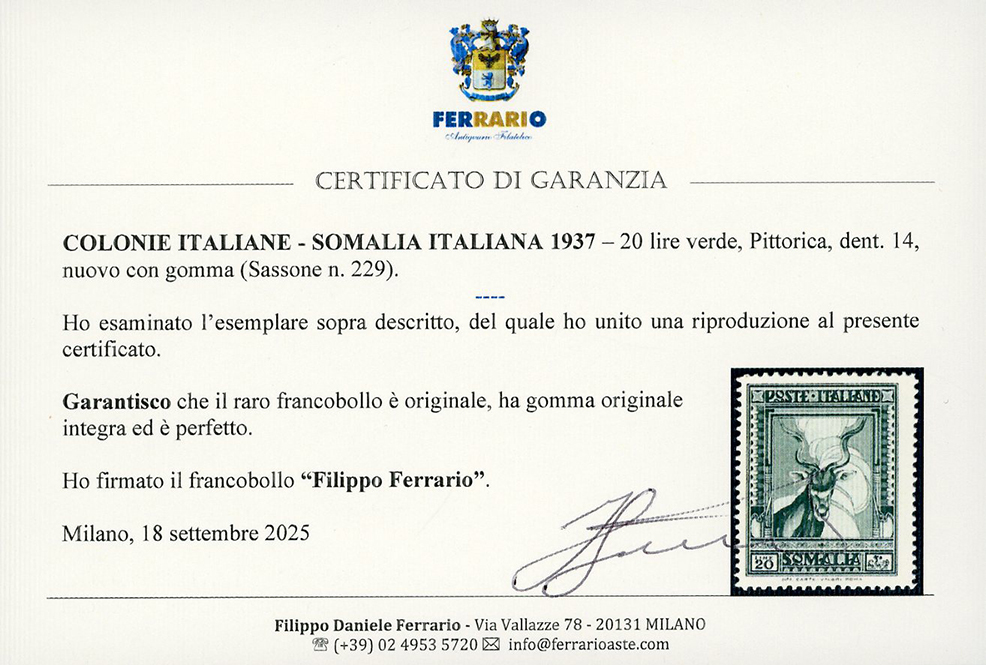 1937 - 20 lire Pittorica, dent. 14 (229), nuovo, gomma originale integra, perfetto. Molto raro e di ottima qualità. Cert. Cilio e Ferrario. Leggi tutto