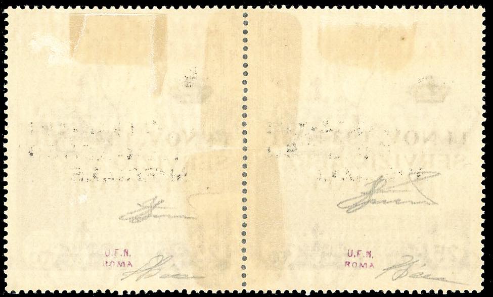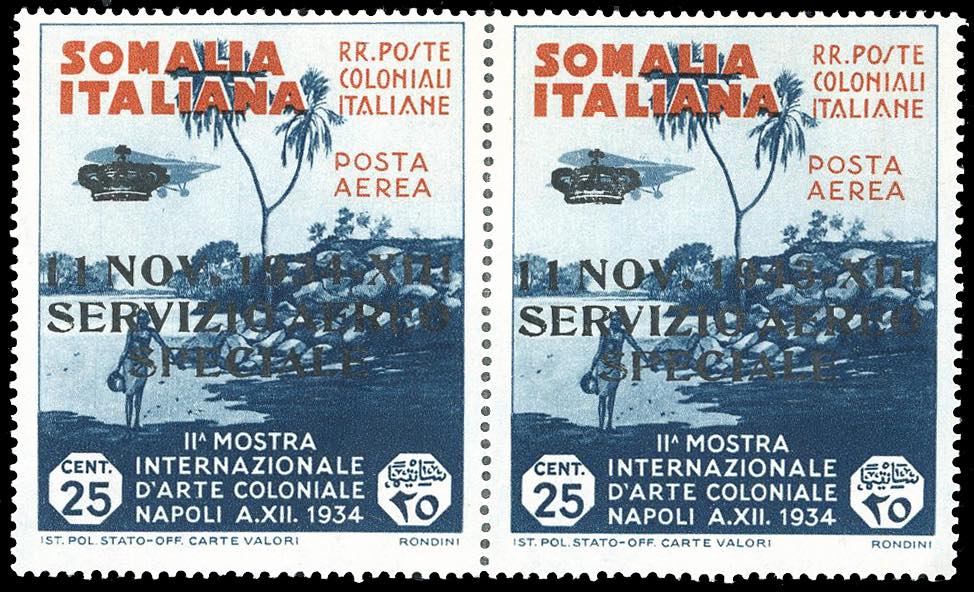 SERVIZIO AEREO 1934 - 25 cent. soprastampato "Servizio Aereo Speciale", coppia orizzontale, il primo esemplare con soprastampa "1934", il secondo "1943" (2,2a), nuova, gomma originale, perfetta. Rara. Diena, cert. Ferrario. (cat.Sassone € 25.000 come gomma integra).