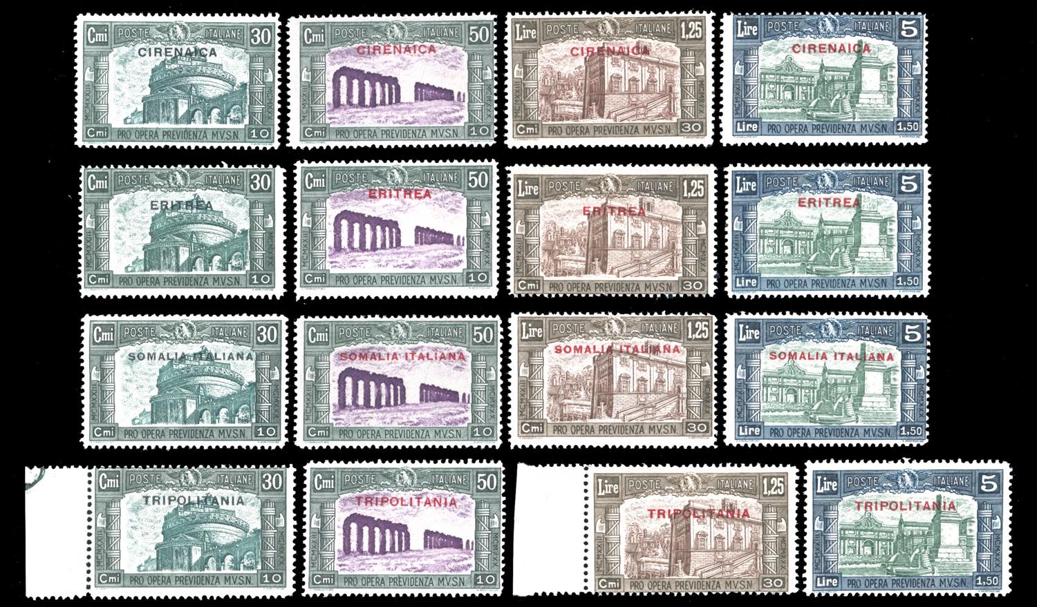 1930 - Milizia III emissione, giro completo delle quattro Colonie, nuovi, gomma originale integra, perfetti e molto freschi. Ferrario.