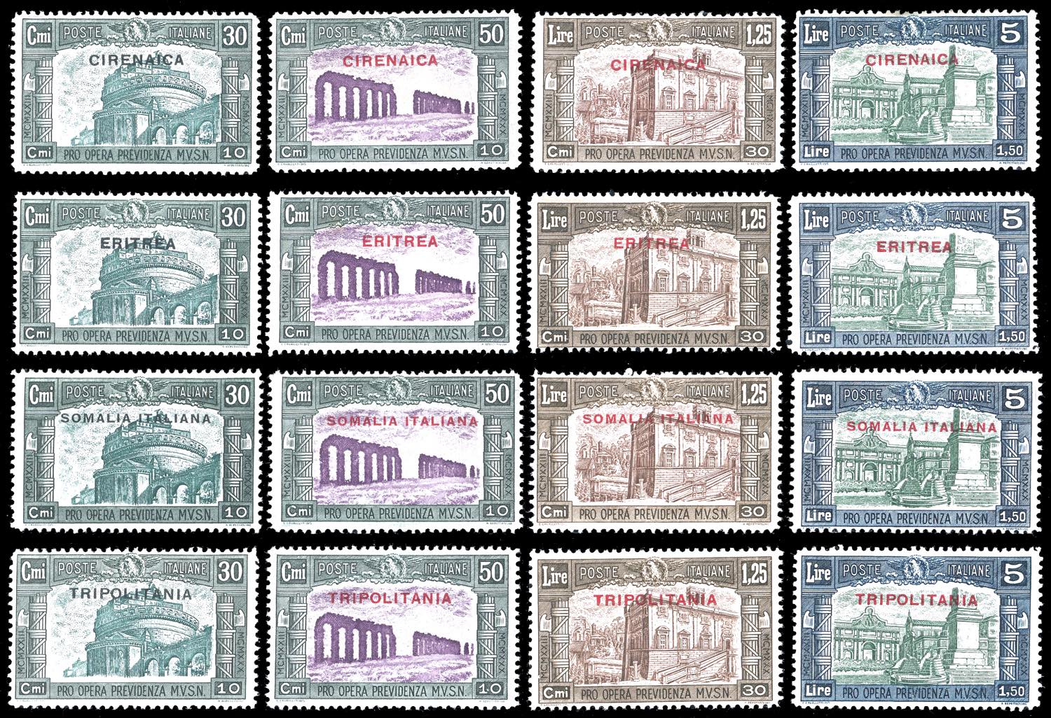 1930 - Milizia, III emissione, giro completo delle quattro Colonie (Cirenaica 68/71,Eritrea 170/173,Somalia 140/143,Tripolitania 69/72), nuovi, gomma originale integra, perfetti. Ferrario.