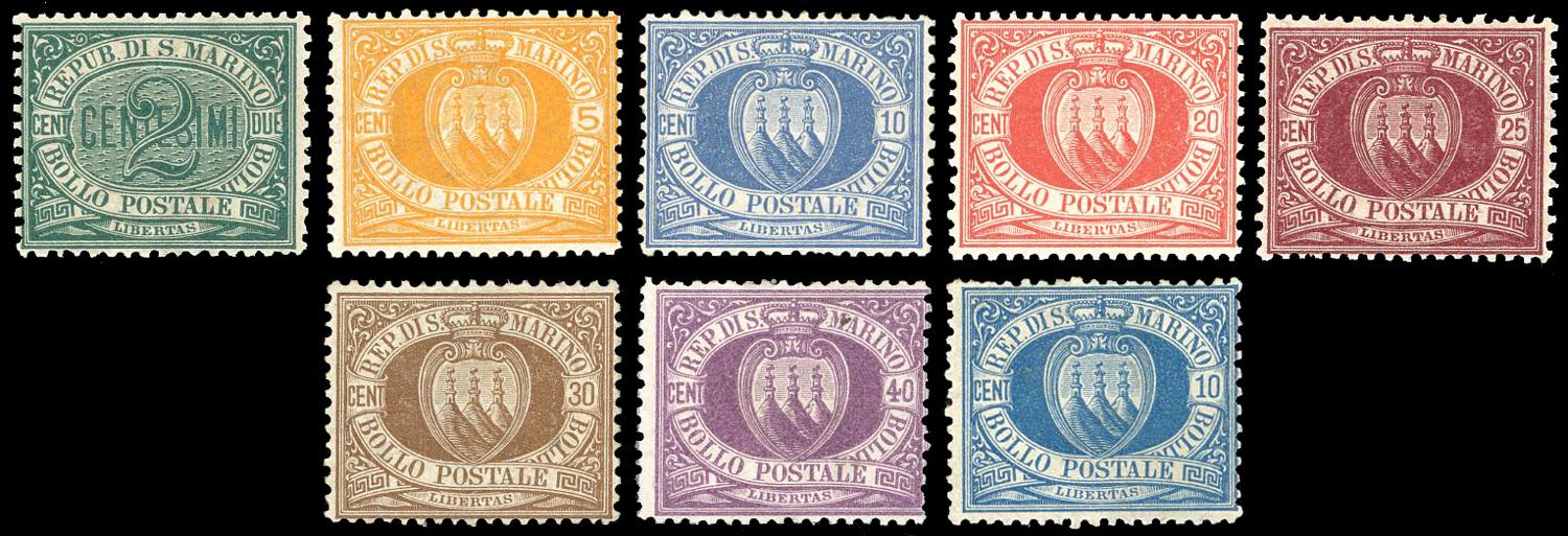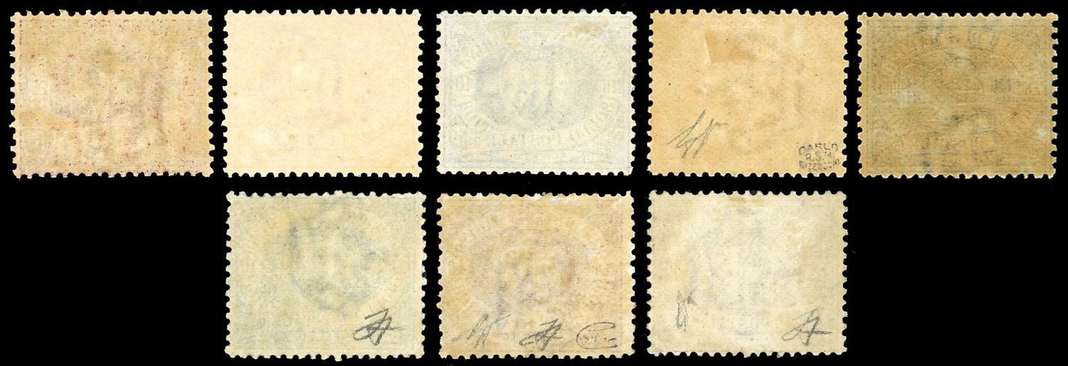 1877/90 - Cifra o Stemma, serie completa e 10 cent. azzurro (1/7,3A), nuovi, gomma originale, perfetti. Cert. Ferrario.