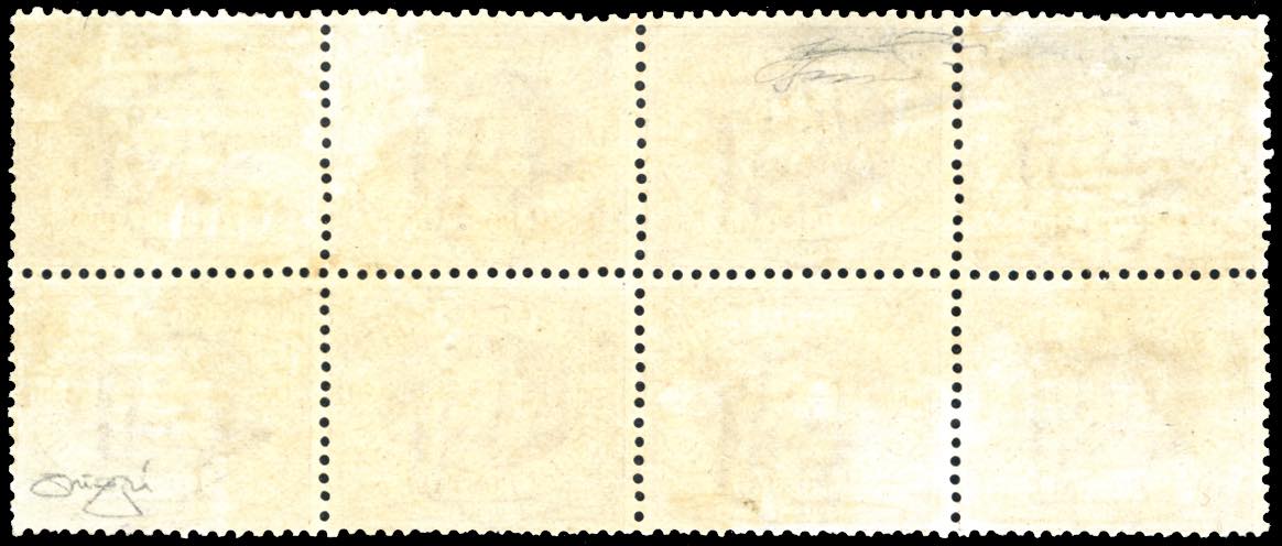 1877 - 30 cent. bruno Stemma (6), eccezionale blocco di otto esemplari, gomma originale integra, impercettibile traccia di linguella su un solo esemplare, perfetto e molto fresco. Si tratta del MASSIMO MULTIPLO NOTO DI QUESTO FRANCOBOLLO, in splendide condizioni qualitative. Cert. Oro Raybaudi e Ferrario.