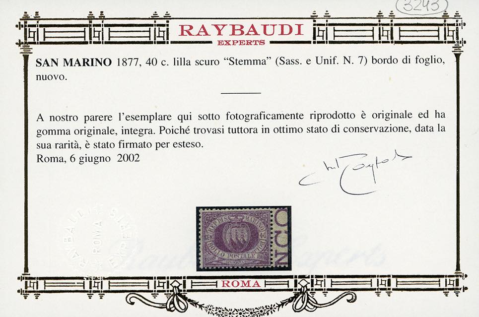 1877 - 40 cent. Stemma (7), bordo di foglio, nuovo, gomma originale integra, perfetto e molto fresco. G.Bolaffi, cert. Oro Raybaudi (cat.Sassone € 4.200/13.500).