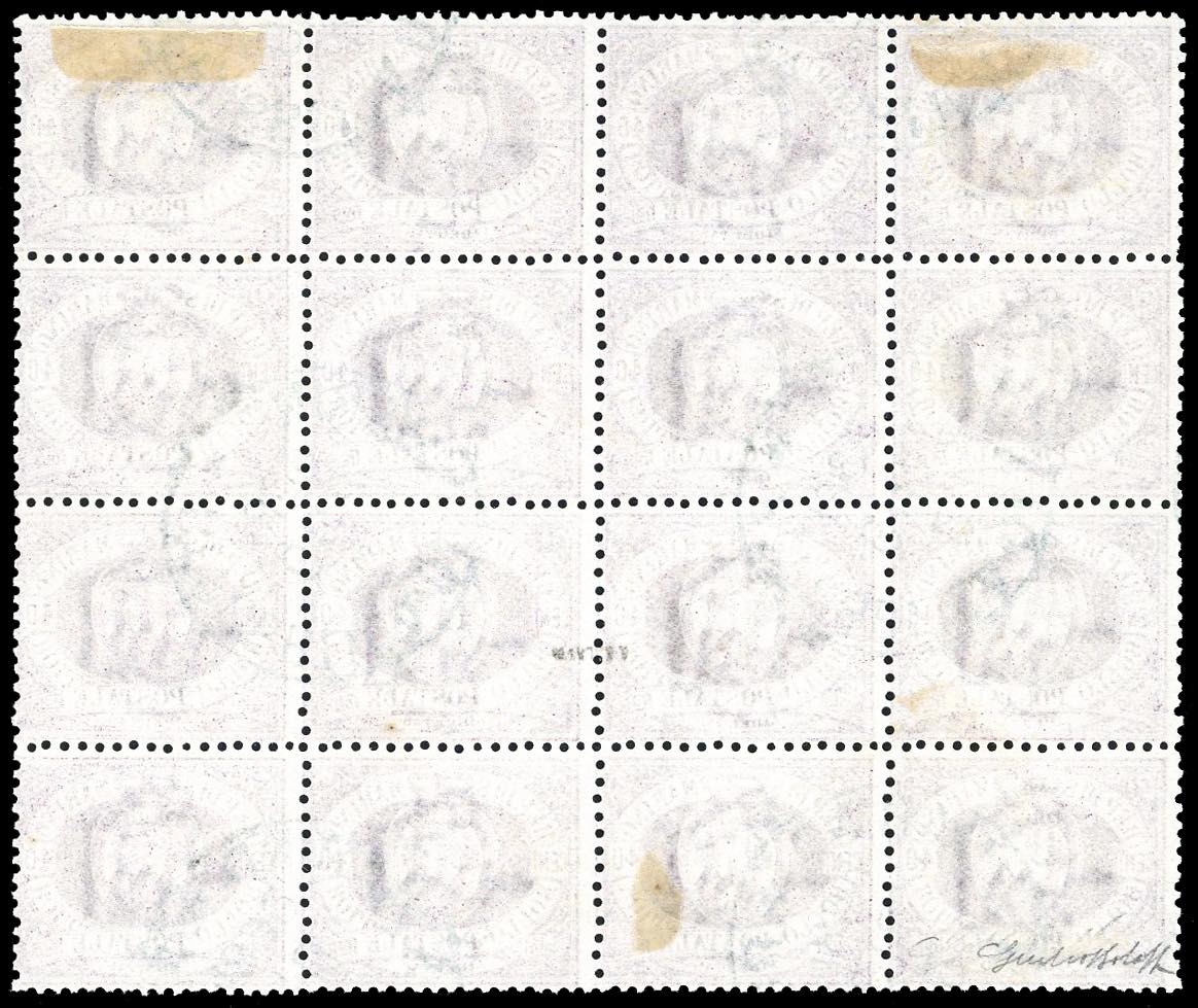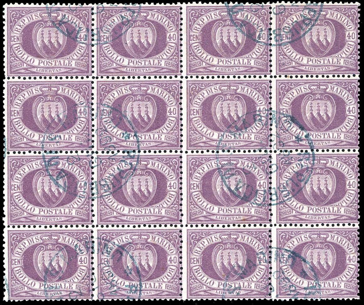1877 - 40 cent. Stemma (7), blocco di 16, perfetto, usato. Eccezionale, massimo multiplo noto di questo valore, rarità. Giulio Bolaffi per esteso. (cat.Sassone € 16.000 per quattro quartine).