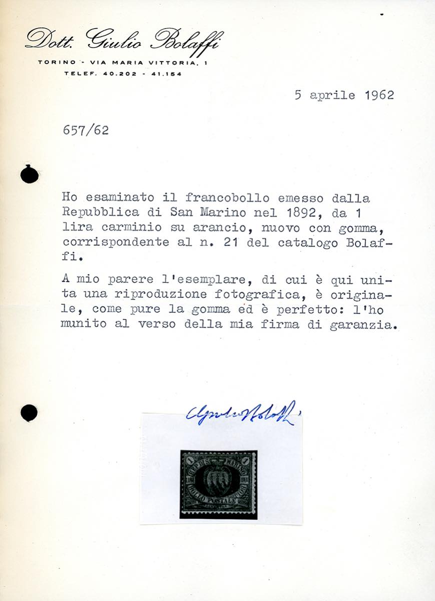 1892 - 1 lira carminio su giallo Stemma (20), nuovo, gomma originale integra, perfetto. Cert. G.Bolaffi.