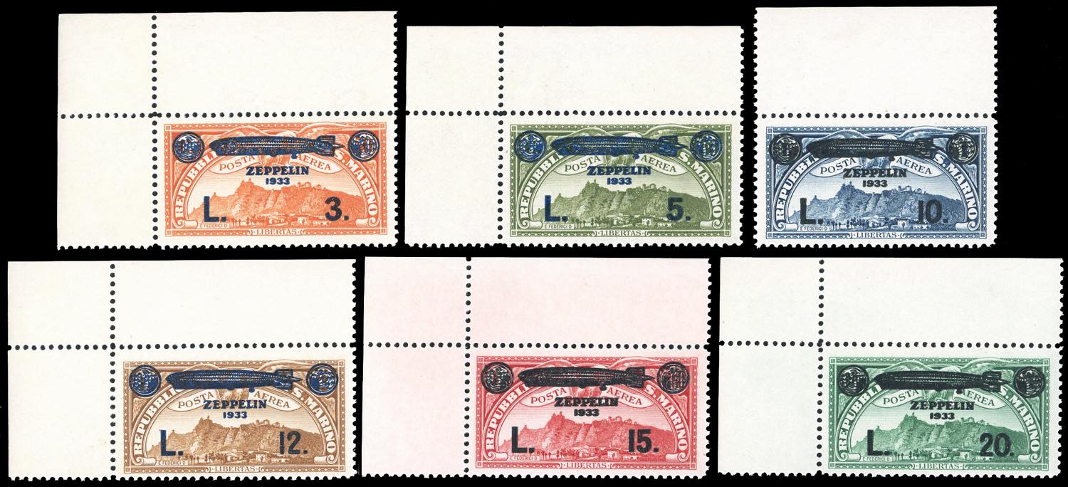 1933 - Zeppelin, serie completa (11/16), tutti angolo/bordo di foglio, nuovi, gomma originale integra, perfetti. Splendidi. Ferrario.